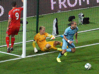 City's winning start to the season continued with a convincing victory over Liverpool. The visitors had the best of the first 30 minutes and were quicker to the ball and the City defence did well to protect Joe Hart from having to save the day. A goal just before half time by the new born Stevan Jovetic He was helped by Nasri and Silva and it was perfect timing. His second goal early in the second half was the climax of a 19 pass move with Nasri providing the final pass. Jovetic had a good pre-season and his form is continuing - a good sign especially with Negredo off injured for a while. With just over 20 minutes left Dzeko had to go off injured and on came Aguero to great applause from City fans. He has been on the field for less than thirty seconds before he latched onto a great pass from Navas and cracked the ball into the net to make it three nil and match over! Liverpool got a late goal but City dominated play and deserved their win. Clichy did really well at left back - his spell at right back in pre-season must have helped. Fernando did well in front of the back four but I thought Toure held onto the ball too much and rarely got forward. Not impressed with the new advertising running along tier two and the offer of digitizing flags is a joke as the height of the advertising is so small you would never see any detail on the digital flags