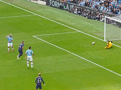 After just 20 minutes a terrific cross by De Bruyne is headed home by Sterling from a narrow angle and City are one up and the South Stand celebrate