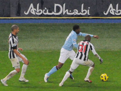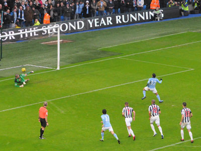 Following a free kick for a foul on Tevez Kolarov made a break down the left wing and was brought down by Reid and a penalty was awarded