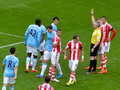 Fernandinho gets a yellow card and surely Mr Hughes is not asking the 4th official for more !