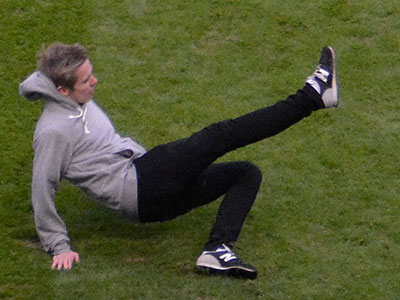 During the half time interval Sam's last chance to win a ticket to the Cup Final goes begging as he slips in his attempt to score!