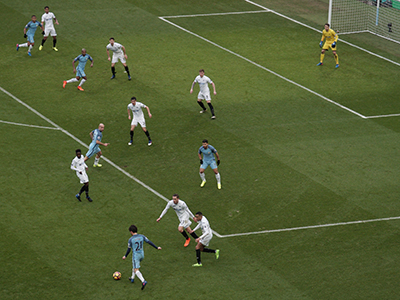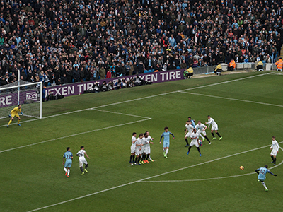 Yaya Toure takes the free kick and it flies towards the top corner........