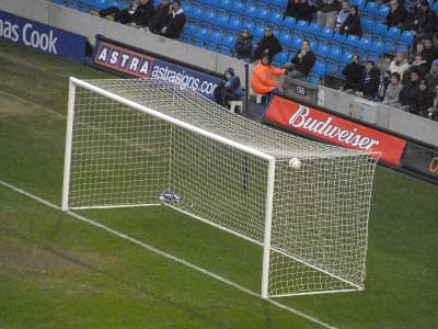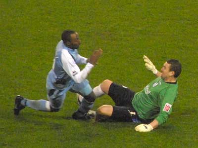 After a short break and a drink ( hope it was not alcoholic) he recovered just in time to pick the ball out of the net. Immediately after the incident Corradi set the ball up for Vassell...................