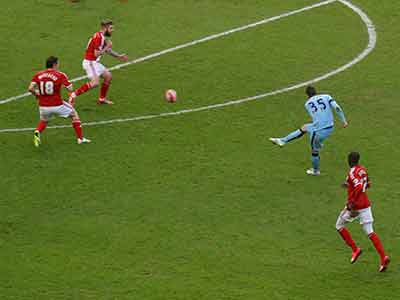 ..the ball rolls free and Bamford is quick to pounce beating Fernando and the ball is in the net while Caballero and Adomah are still on the ground!