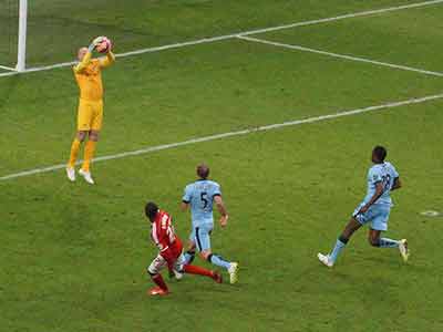 two minutes later Aguero clashes with Clayton and falls to the ground. A penalty perhaps!. Not given !