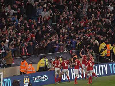 The Middlesbrough players and fans celebrate and City are a goal down gain in a cup tie!