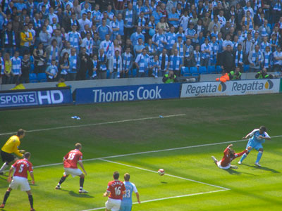 Well now we know for certain. City hold the record for the lowest number of goals scored at home by a club in the leading division of the football league- just 10. If it wasn't for the flurry of away points in March and early April we would be set for relegation. There must be drastic changes in the close season as the situation at the moment is unacceptable. The take-over cannot come quickly enough to get some cash to improve the squad. Incidentally I am sure will see many exits from the present squad. United won this derby without really breaking into a sweat though City tried very hard and had Vassell scored with the penalty United might have had some uncomfortable moments before the final whistle. If Chelsea fail to beat Arsenal in their game United will be Champions. The largest crowd of the season created the best atmosphere yet at COMS helped no doubt by the free scarves!