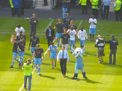 The City and United supporters in the South Stand exchanged pleasantries at the end of the game before the City manager and players came on to give their thanks. This was a some what muted affair as many supporters had gone and they came on ever so briefly and barely touched the centre circle!