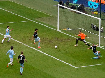 On 66 minutes a good cross from Zabaleta looks certain to be met by Aguero....