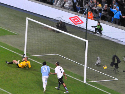 In the 18th minute ex City player Tyrone Mears had his cross blocked by Lescott with his hand! Penalty!