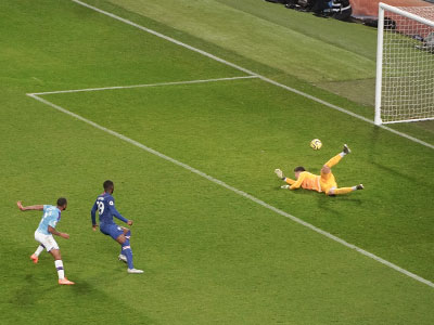 In added time Mahrez passes to Sterling whose feet are onside and he shoots past Kepa....