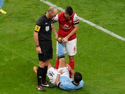Dzeko is brought down and he checks whether the linesman has seen the foul