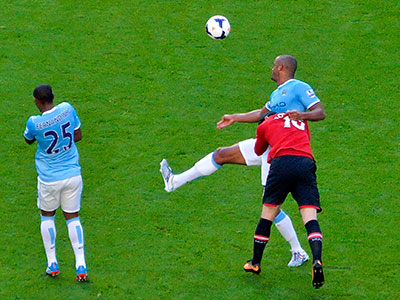 a few minutes later and Navas picks up the ball in his own half and dashes into the United half belatedly pursued by Fellani....