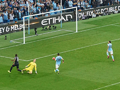 With five minutes left a corner taken by de Bruyne is headed by Otamendi but West Ham's man of the match Adrian again makes a great save and City lose their unbeaten record but stay top of the league