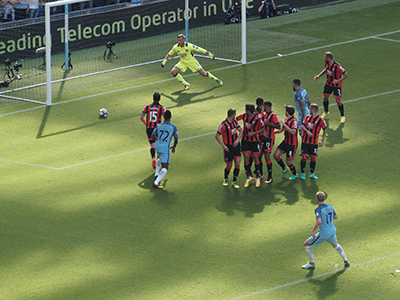 Another free kick for De Bruyne but this time much further out and his shot went over the wall and tested the keeper
