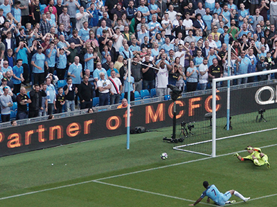 The keeper is helpless as the ball flies past him into the net and City are one up!