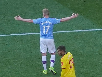 A few minutes later De Bruyne gets in a cross following a corner and Otamendi has a header blocked but the ball runs to........